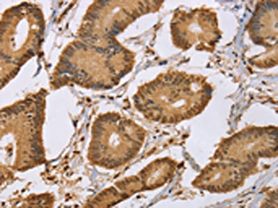 The image on the left is immunohistochemistry of paraffin-embedded Human colon cancer tissue using CSB-PA194515(CEL Antibody) at dilution 1/50, on the right is treated with synthetic peptide. (Original magnification: ×200)