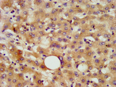 IHC image of CSB-PA005369LA01HU diluted at 1:800 and staining in paraffin-embedded human liver tissue performed on a Leica BondTM system. After dewaxing and hydration, antigen retrieval was mediated by high pressure in a citrate buffer (pH 6.0). Section was blocked with 10% normal goat serum 30min at RT. Then primary antibody (1% BSA) was incubated at 4°C overnight. The primary is detected by a biotinylated secondary antibody and visualized using an HRP conjugated SP system.