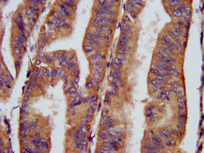 IHC image of CSB-PA005397LA01HU diluted at 1:400 and staining in paraffin-embedded human endometrial cancer performed on a Leica BondTM system. After dewaxing and hydration, antigen retrieval was mediated by high pressure in a citrate buffer (pH 6.0). Section was blocked with 10% normal goat serum 30min at RT. Then primary antibody (1% BSA) was incubated at 4°C overnight. The primary is detected by a biotinylated secondary antibody and visualized using an HRP conjugated SP system.
