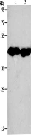 Gel: 10%SDS-PAGE, Lysate: 50 μg, Lane 1-2: Mouse muscle tissue, Mouse Heart tissue, Primary antibody: CSB-PA561050(CKM Antibody) at dilution 1/950, Secondary antibody: Goat anti rabbit IgG at 1/8000 dilution, Exposure time: 2 seconds
