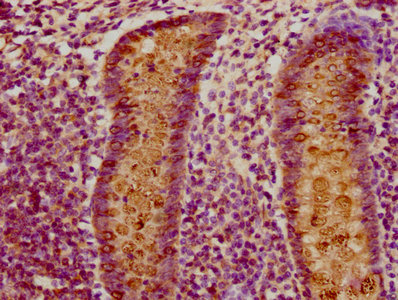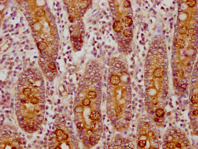 IHC image of CSB-PA005474LA01HU diluted at 1:150 and staining in paraffin-embedded human small intestine tissue performed on a Leica BondTM system. After dewaxing and hydration, antigen retrieval was mediated by high pressure in a citrate buffer (pH 6.0). Section was blocked with 10% normal goat serum 30min at RT. Then primary antibody (1% BSA) was incubated at 4°C overnight. The primary is detected by a biotinylated secondary antibody and visualized using an HRP conjugated SP system.