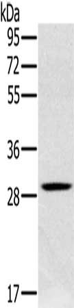 Gel: 10%SDS-PAGE, Lysate: 40 μg, Lane: Human testis tissue, Primary antibody: CSB-PA347049(CLIC1 Antibody) at dilution 1/400, Secondary antibody: Goat anti rabbit IgG at 1/8000 dilution, Exposure time: 1 minute