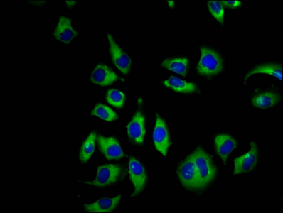 Immunofluorescence staining of A549 cells with CSB-PA623897LA01HU at 1:66, counter-stained with DAPI. The cells were fixed in 4% formaldehyde, permeabilized using 0.2% Triton X-100 and blocked in 10% normal Goat Serum. The cells were then incubated with the antibody overnight at 4°C. The secondary antibody was Alexa Fluor 488-congugated AffiniPure Goat Anti-Rabbit IgG(H+L).