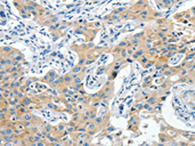The image on the left is immunohistochemistry of paraffin-embedded Human lung cancer tissue using CSB-PA291126(CNTNAP3 Antibody) at dilution 1/40, on the right is treated with synthetic peptide. (Original magnification: ×200)