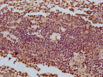 IHC image of CSB-PA896698LA01HU diluted at 1:500 and staining in paraffin-embedded human spleen tissue performed on a Leica BondTM system. After dewaxing and hydration, antigen retrieval was mediated by high pressure in a citrate buffer (pH 6.0). Section was blocked with 10% normal goat serum 30min at RT. Then primary antibody (1% BSA) was incubated at 4°C overnight. The primary is detected by a biotinylated secondary antibody and visualized using an HRP conjugated SP system.