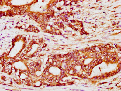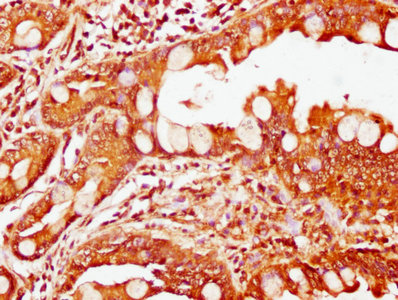 IHC image of CSB-PA882156LA01HU diluted at 1:200 and staining in paraffin-embedded human colon cancer performed on a Leica BondTM system. After dewaxing and hydration, antigen retrieval was mediated by high pressure in a citrate buffer (pH 6.0). Section was blocked with 10% normal goat serum 30min at RT. Then primary antibody (1% BSA) was incubated at 4°C overnight. The primary is detected by a biotinylated secondary antibody and visualized using an HRP conjugated SP system.