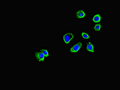 Immunofluorescent analysis of HepG2 cells using CSB-PA880087LA01HU at dilution of 1:100 and Alexa Fluor 488-congugated AffiniPure Goat Anti-Rabbit IgG(H+L)