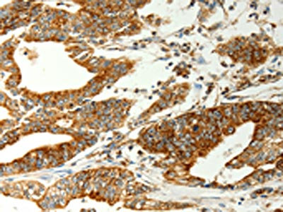 The image on the left is immunohistochemistry of paraffin-embedded Human colon cancer tissue using CSB-PA017662(COX7B Antibody) at dilution 1/70, on the right is treated with fusion protein. (Original magnification: ×200)