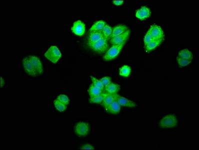 Immunofluorescence staining of HepG2 cells with CSB-PA005910LA01HU at 1:100, counter-stained with DAPI. The cells were fixed in 4% formaldehyde, permeabilized using 0.2% Triton X-100 and blocked in 10% normal Goat Serum. The cells were then incubated with the antibody overnight at 4°C. The secondary antibody was Alexa Fluor 488-congugated AffiniPure Goat Anti-Rabbit IgG(H+L).