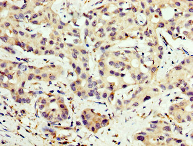IHC image of CSB-PA005925LA01HU diluted at 1:200 and staining in paraffin-embedded human liver cancer performed on a Leica BondTM system. After dewaxing and hydration, antigen retrieval was mediated by high pressure in a citrate buffer (pH 6.0). Section was blocked with 10% normal goat serum 30min at RT. Then primary antibody (1% BSA) was incubated at 4°C overnight. The primary is detected by a biotinylated secondary antibody and visualized using an HRP conjugated SP system.
