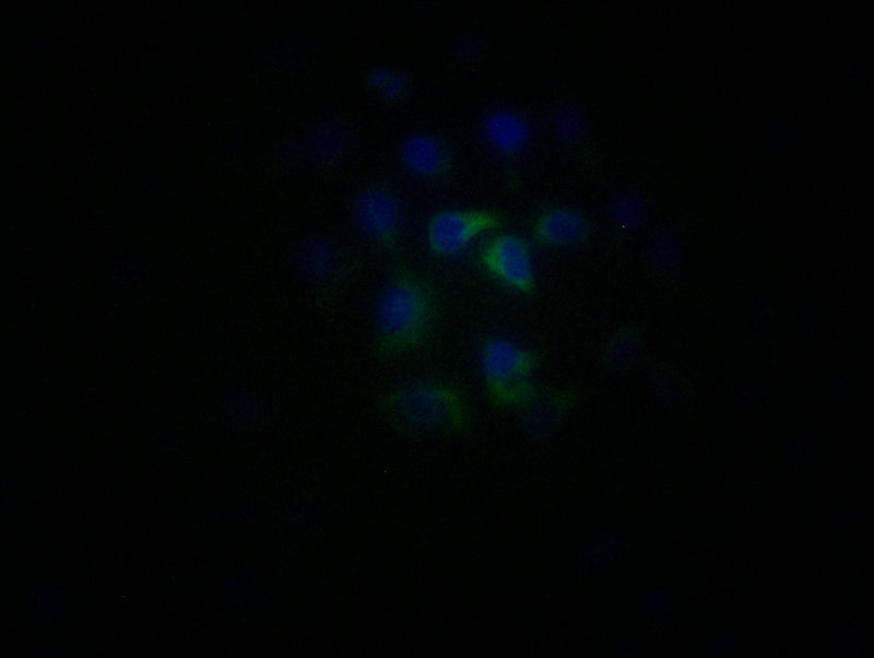 Immunofluorescence staining of MCF-7 cells with CSB-PA822164ESR1HU at 1:25, counter-stained with DAPI. The cells were fixed in 4% formaldehyde, permeabilized using 0.2% Triton X-100 and blocked in 10% normal Goat Serum. The cells were then incubated with the antibody overnight at 4°C. The secondary antibody was Alexa Fluor 488-congugated AffiniPure Goat Anti-Rabbit IgG(H+L).