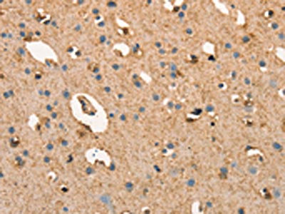 The image on the left is immunohistochemistry of paraffin-embedded Human brain tissue using CSB-PA256217(CRELD1 Antibody) at dilution 1/40, on the right is treated with synthetic peptide. (Original magnification: ×200)