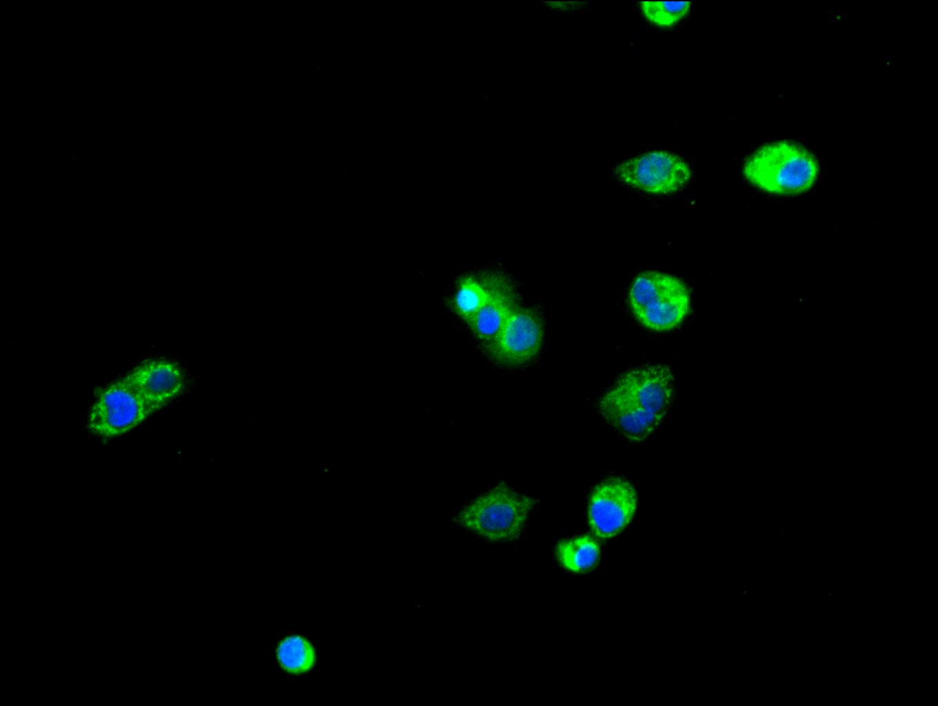 Immunofluorescence staining of U251 cell with CSB-PA757785LA01HU at 1:20, counter-stained with DAPI. The cells were fixed in 4% formaldehyde and blocked in 10% normal Goat Serum. The cells were then incubated with the antibody overnight at 4C. The secondary antibody was Alexa Fluor 488-congugated AffiniPure Goat Anti-Rabbit IgG(H+L).