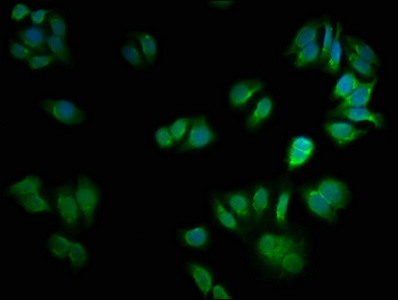 Immunofluorescence staining of HepG2 cells with CSB-PA526319HA01HU at 1:66, counter-stained with DAPI. The cells were fixed in 4% formaldehyde, permeabilized using 0.2% Triton X-100 and blocked in 10% normal Goat Serum. The cells were then incubated with the antibody overnight at 4°C. The secondary antibody was Alexa Fluor 488-congugated AffiniPure Goat Anti-Rabbit IgG(H+L).