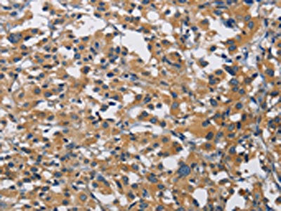 The image on the left is immunohistochemistry of paraffin-embedded Human thyroid cancer tissue using CSB-PA437759(CST4 Antibody) at dilution 1/60, on the right is treated with fusion protein. (Original magnification: ×200)