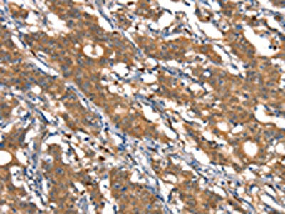The image on the left is immunohistochemistry of paraffin-embedded Human gastric cancer tissue using CSB-PA027621(CSTB Antibody) at dilution 1/30, on the right is treated with synthetic peptide. (Original magnification: ×200)