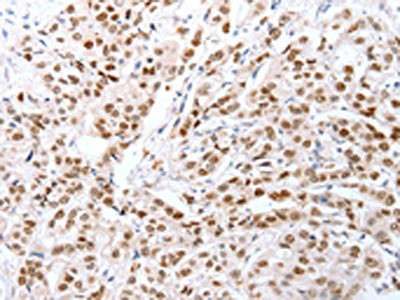 The image on the left is immunohistochemistry of paraffin-embedded Human breast cancer tissue using CSB-PA062537(CTBP2 Antibody) at dilution 1/25, on the right is treated with fusion protein. (Original magnification: ×200)
