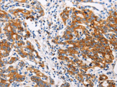 The image on the left is immunohistochemistry of paraffin-embedded Human gastic cancer tissue using CSB-PA096507(CTNNA1 Antibody) at dilution 1/35, on the right is treated with fusion protein. (Original magnification: ×200)