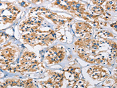 The image on the left is immunohistochemistry of paraffin-embedded Human thyroid cancer tissue using CSB-PA092272(CTSL Antibody) at dilution 1/40, on the right is treated with fusion protein. (Original magnification: ×200)