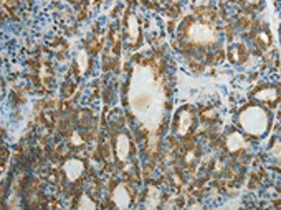 The image on the left is immunohistochemistry of paraffin-embedded Human thyroid cancer tissue using CSB-PA233120(CTSV Antibody) at dilution 1/50, on the right is treated with fusion protein. (Original magnification: ×200)