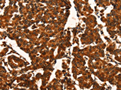 The image on the left is immunohistochemistry of paraffin-embedded Human gastric cancer tissue using CSB-PA283839(CUEDC2 Antibody) at dilution 1/50, on the right is treated with fusion protein. (Original magnification: ×200)