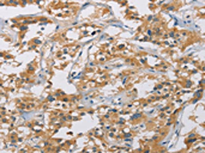 The image on the left is immunohistochemistry of paraffin-embedded Human thyroid cancer tissue using CSB-PA913264(CYP4A11 Antibody) at dilution 1/25, on the right is treated with fusion protein. (Original magnification: ×200)