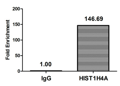 Chromatin Immunoprecipitation Hela (4*106, treated with 30mM sodium crotonylate for 4h) were treated with Micrococcal Nuclease, sonicated, and immunoprecipitated with 5µg anti-HIST1H4A (CSB-PA010429OA05crHU) or a control normal rabbit IgG. The resulting ChIP DNA was quantified using real-time PCR with primers against the β-Globin promoter.
