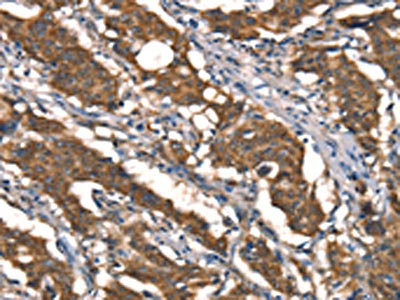 The image on the left is immunohistochemistry of paraffin-embedded Human gastric cancer tissue using CSB-PA135938(DAAM1 Antibody) at dilution 1/40, on the right is treated with synthetic peptide. (Original magnification: ×200)