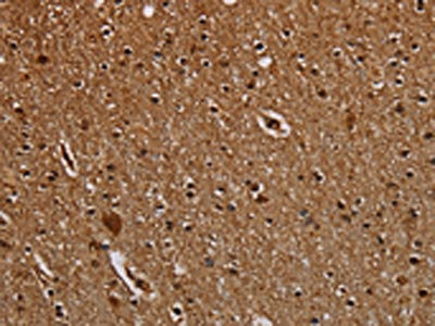 The image on the left is immunohistochemistry of paraffin-embedded Human brain tissue using CSB-PA203330(DCAF6 Antibody) at dilution 1/50, on the right is treated with synthetic peptide. (Original magnification: ×200)