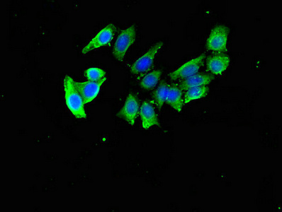 Immunofluorescent analysis of PC-3 cells using CSB-PA880116LA01HU at dilution of 1:100 and Alexa Fluor 488-congugated AffiniPure Goat Anti-Rabbit IgG(H+L)