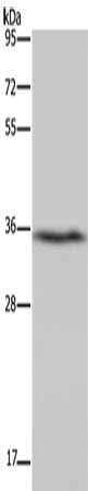 Gel: 10%SDS-PAGE, Lysate: 40 μg, Lane: Human fetal liver tissue, Primary antibody: CSB-PA877002(DDAH1 Antibody) at dilution 1/400, Secondary antibody: Goat anti rabbit IgG at 1/8000 dilution, Exposure time: 30 seconds