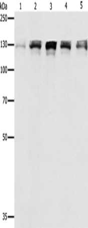 Gel: 8%SDS-PAGE, Lysate: 40 μg, Lane 1-5: Human fetal small intestine tissue, Human liver cancer tissue, Human lymphoma tissue, 293T cells, A549 cells, Primary antibody: CSB-PA282824(DDB1 Antibody) at dilution 1/500, Secondary antibody: Goat anti rabbit IgG at 1/8000 dilution, Exposure time: 50 seconds