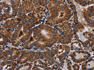 The image on the left is immunohistochemistry of paraffin-embedded Human thyroid cancer tissue using CSB-PA211015(DISC1 Antibody) at dilution 1/30, on the right is treated with synthetic peptide. (Original magnification: ×200)