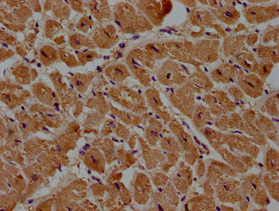 IHC image of CSB-PA621878LA01HU diluted at 1:100 and staining in paraffin-embedded human heart tissue performed on a Leica BondTM system. After dewaxing and hydration, antigen retrieval was mediated by high pressure in a citrate buffer (pH 6.0). Section was blocked with 10% normal goat serum 30min at RT. Then primary antibody (1% BSA) was incubated at 4°C overnight. The primary is detected by a biotinylated secondary antibody and visualized using an HRP conjugated SP system.