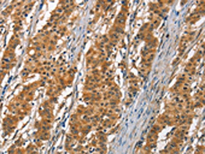 The image on the left is immunohistochemistry of paraffin-embedded Human gastric cancer tissue using CSB-PA274333(DKK3 Antibody) at dilution 1/30, on the right is treated with fusion protein. (Original magnification: ×200)