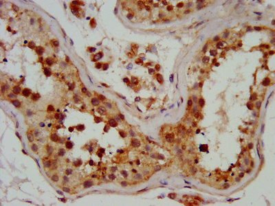 IHC image of CSB-PA885692LA01HU diluted at 1:700 and staining in paraffin-embedded human testis tissue performed on a Leica BondTM system. After dewaxing and hydration, antigen retrieval was mediated by high pressure in a citrate buffer (pH 6.0). Section was blocked with 10% normal goat serum 30min at RT. Then primary antibody (1% BSA) was incubated at 4°C overnight. The primary is detected by a biotinylated secondary antibody and visualized using an HRP conjugated SP system.