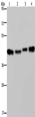 Gel: 8%SDS-PAGE, Lysate: 40 μg, Lane 1-4: HepG2 cells, Raji cells, A431 cells, 231 cells, Primary antibody: CSB-PA201270(DNAJA1 Antibody) at dilution 1/800, Secondary antibody: Goat anti rabbit IgG at 1/8000 dilution, Exposure time: 5 seconds