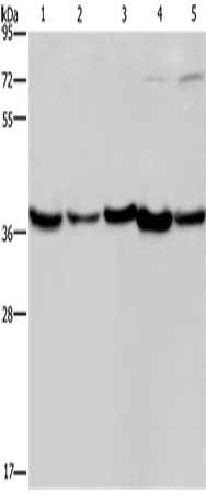 Gel: 8%SDS-PAGE, Lysate: 40 μg, Lane 1-5: Human fetal liver tissue, mouse skeletal muscle tissue, Mouse heart tissue, Hela cells, Jurkat cells, Primary antibody: CSB-PA727123(DNAJB4 Antibody) at dilution 1/200, Secondary antibody: Goat anti rabbit IgG at 1/8000 dilution, Exposure time: 15 seconds