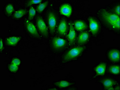 Immunofluorescence staining of Hela cells with CSB-PA619864LA01HU at 1:66, counter-stained with DAPI. The cells were fixed in 4% formaldehyde, permeabilized using 0.2% Triton X-100 and blocked in 10% normal Goat Serum. The cells were then incubated with the antibody overnight at 4°C. The secondary antibody was Alexa Fluor 488-congugated AffiniPure Goat Anti-Rabbit IgG(H+L).