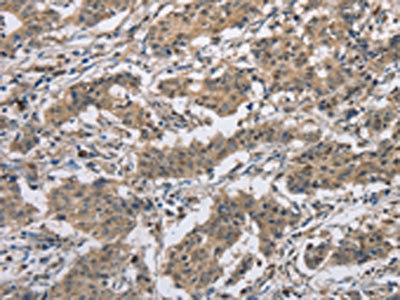 The image on the left is immunohistochemistry of paraffin-embedded Human gastric cancer tissue using CSB-PA025645(DSG2 Antibody) at dilution 1/50, on the right is treated with fusion protein. (Original magnification: ×200)