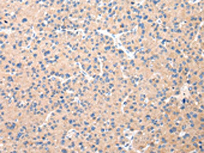 The image on the left is immunohistochemistry of paraffin-embedded Human liver cancer tissue using CSB-PA032749(DUSP11 Antibody) at dilution 1/25, on the right is treated with fusion protein. (Original magnification: ×200)