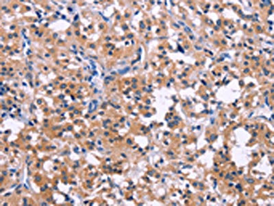 The image on the left is immunohistochemistry of paraffin-embedded Human thyroid cancer tissue using CSB-PA176280(DUSP13 Antibody) at dilution 1/50, on the right is treated with fusion protein. (Original magnification: ×200)
