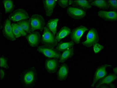 Immunofluorescence staining of A549 cells with CSB-PA007385LA01HU at 1:133, counter-stained with DAPI. The cells were fixed in 4% formaldehyde, permeabilized using 0.2% Triton X-100 and blocked in 10% normal Goat Serum. The cells were then incubated with the antibody overnight at 4°C. The secondary antibody was Alexa Fluor 488-congugated AffiniPure Goat Anti-Rabbit IgG(H+L).