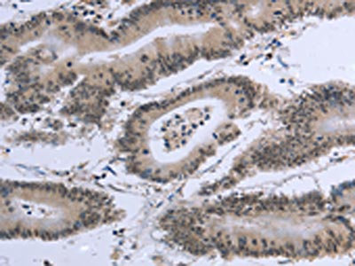 The image on the left is immunohistochemistry of paraffin-embedded Human colon cancer tissue using CSB-PA448901(EID1 Antibody) at dilution 1/20, on the right is treated with fusion protein. (Original magnification: ×200)