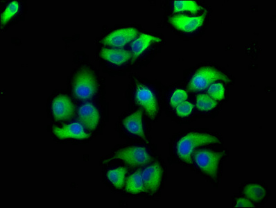 Immunofluorescence staining of Hela cells with CSB-PA007512LA01HU at 1:100, counter-stained with DAPI. The cells were fixed in 4% formaldehyde, permeabilized using 0.2% Triton X-100 and blocked in 10% normal Goat Serum. The cells were then incubated with the antibody overnight at 4°C. The secondary antibody was Alexa Fluor 488-congugated AffiniPure Goat Anti-Rabbit IgG(H+L).