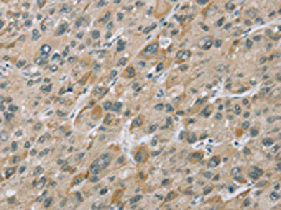 The image on the left is immunohistochemistry of paraffin-embedded Human liver cancer tissue using CSB-PA915667(EIF5 Antibody) at dilution 1/25, on the right is treated with fusion protein. (Original magnification: ×200)