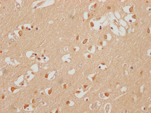 IHC image of CSB-PA618895LA01HU diluted at 1:200 and staining in paraffin-embedded human brain tissue performed on a Leica BondTM system. After dewaxing and hydration, antigen retrieval was mediated by high pressure in a citrate buffer (pH 6.0). Section was blocked with 10% normal goat serum 30min at RT. Then primary antibody (1% BSA) was incubated at 4°C overnight. The primary is detected by a Goat anti-rabbit polymer IgG labeled by HRP and visualized using 0.05% DAB.