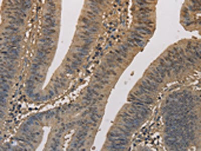 The image on the left is immunohistochemistry of paraffin-embedded Human colon cancer tissue using CSB-PA939360(ELOVL1 Antibody) at dilution 1/50, on the right is treated with fusion protein. (Original magnification: ×200)