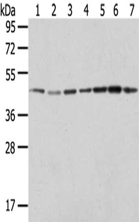 Gel: 8%SDS-PAGE,Lysate: 40 μg,Lane 1-7: Raji cells, A549 cells, Hela cells, HepG2 cells, 231 cells, K562 cells, A431 cells,Primary antibody: CSB-PA580639(ERP44 Antibody) at dilution 1/200 dilution,Secondary antibody: Goat anti rabbit IgG at 1/8000 dilution,Exposure time: 10 seconds