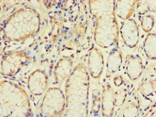 Immunohistochemistry of paraffin-embedded human stomach tissue using CSB-PA007876LA01HU at dilution of 1:100